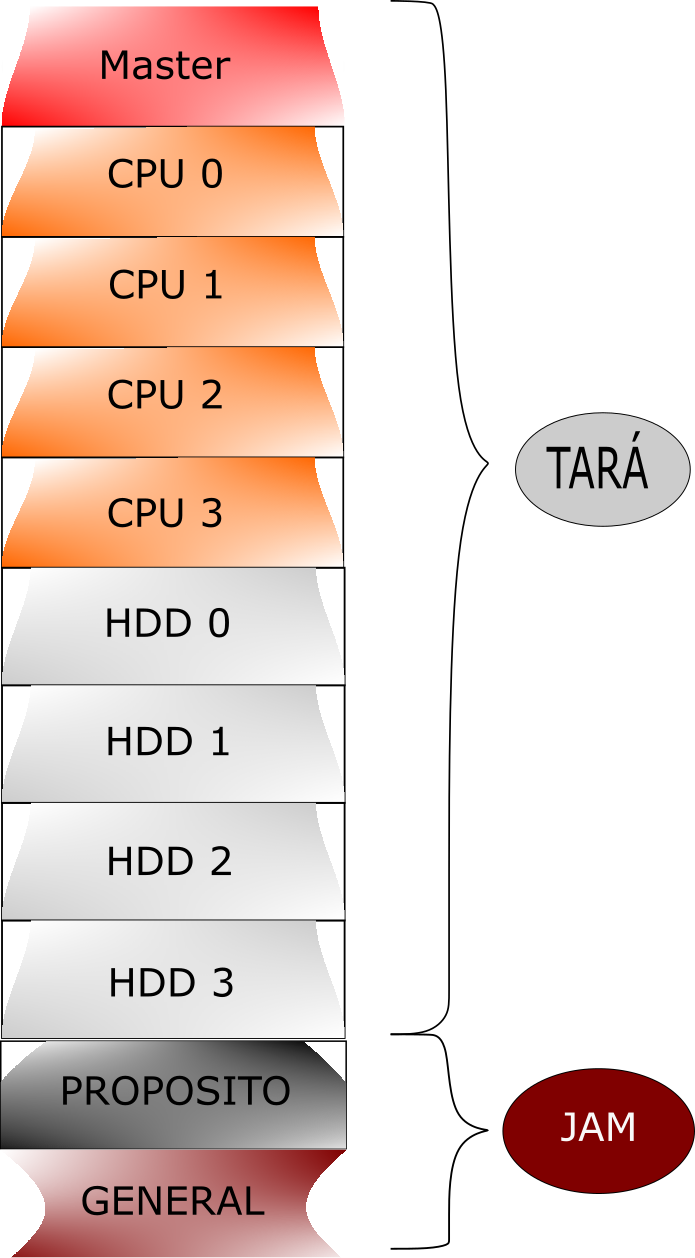 *Cuatro nodos de procesamiento, cada uno con 32 núcleos y con dos tarjetas Nvidia Tesla K20m, en racks R720. *Cuatro nodos de almacenamiento, cada uno con 12 unidades de almacenamiento Constellation ES.3, de 4 TB de almacenamiento para un total de 192 TB, montados en racks R720xd. *Un nodo maestro como proxy, gestor de tareas y calendarización. El nodo maestro del cluster debe ser usado solamente para editar archivos, compilar programas y para realizar pequeñas tareas. Si se realiza un cálculo de gran magnitud, afectaria a otros usuarios, además de estar limitado a los recursos de ese nodo. *Un Switch Dell Powerconnect 8164. *Una UPS Eaton de 5-60 KVA, Trifásica. *Nodos JAM.
